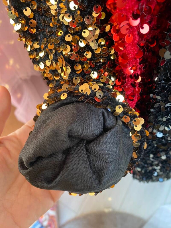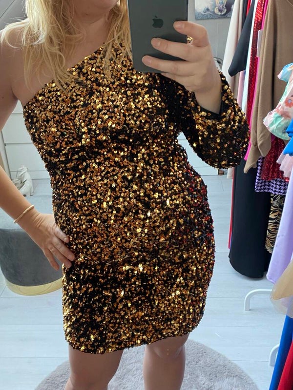 bijzonderheden : jurk heeft aan de rechterarm een mouw, en een ritssluiting, onderjurk, zacht afgewerkte pallietten.