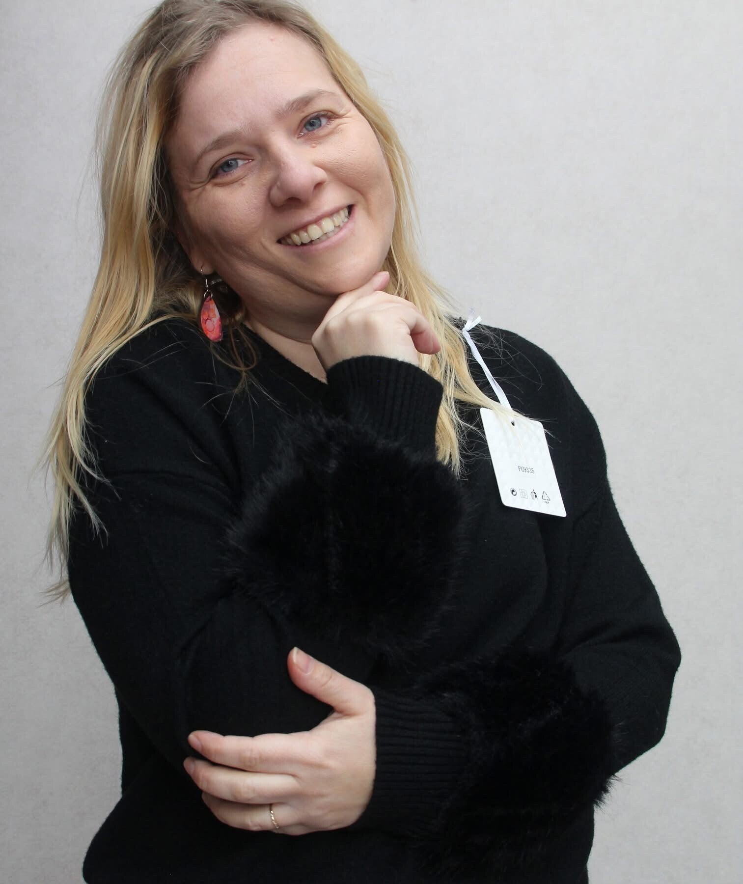 stof : Viscose (53%), Polyester (24%), Polyamide (23%)maat - 36-42 (kleine 44 )Model draagt normaliter 36Bijzonderheden : Fluffy mouwen artikelcode : 000000066