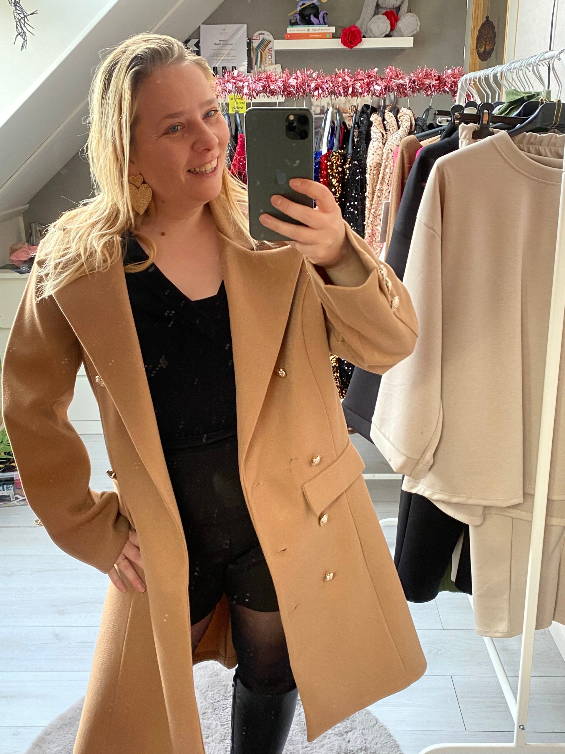 Stof : 100% polyesterkleur: camel maat 38 -44Lange jas, geschikt voor voor/najaar, auto, tussen jas. voorzien van gouden knopen
