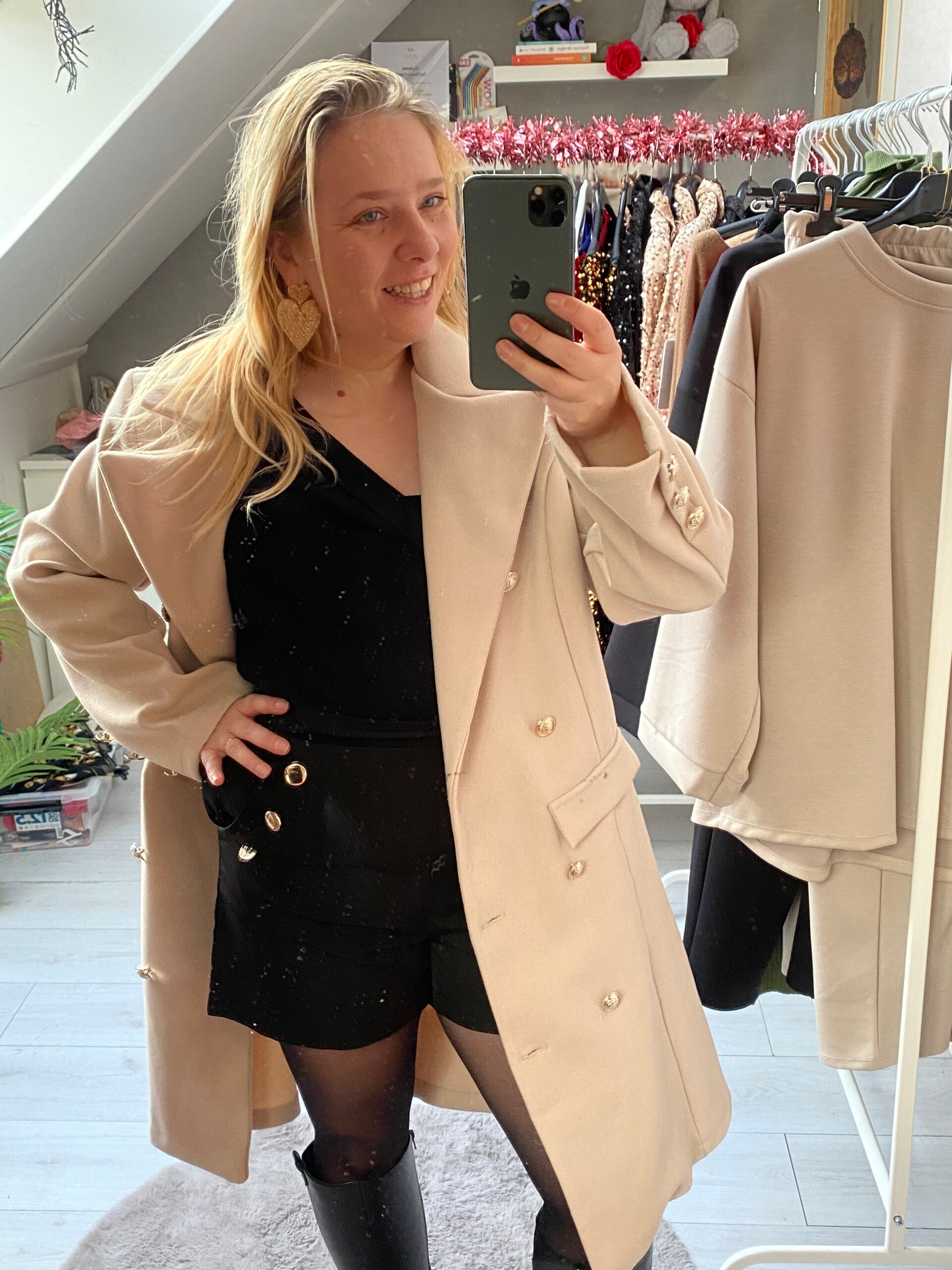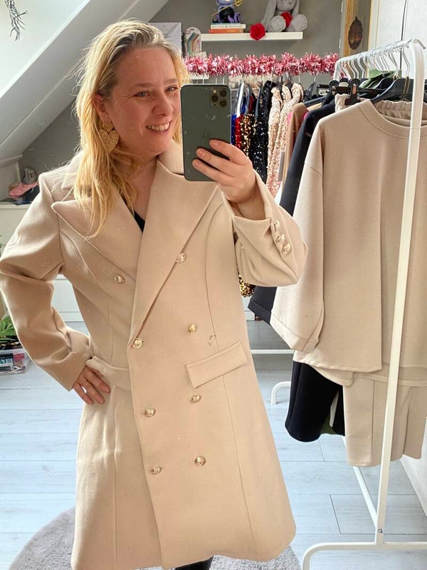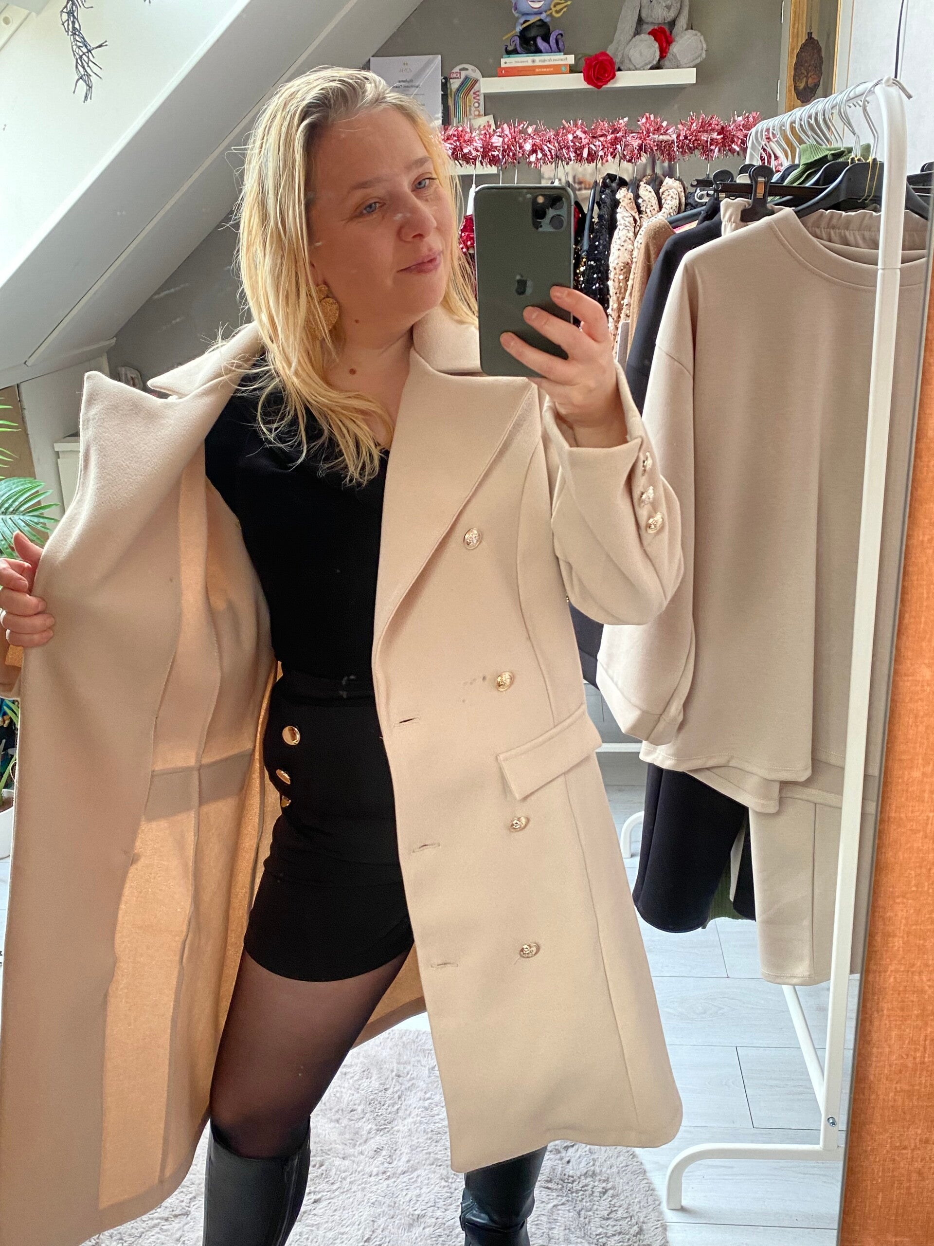Stof : 100% polyesterkleur : beigemaat 38-44Lange jas, geschikt voor voor/najaar, auto, tussen jas. voorzien van gouden knopen