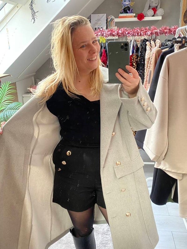 Stof : 100% polyesterkleur: grijsmaat 38 -44Lange jas, geschikt voor voor/najaar, auto, tussen jas. voorzien van gouden knopen
